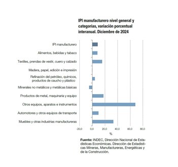 Por último, la rama de “muebles y otras industrias manufactureras” registró un incremento del nivel de actividad del 33,4% en diciembre, mientras que el total del 2024 terminó con una retracción del 18,6%.