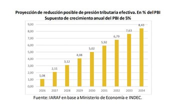 En este escenario, la caída promedio anual de la presión tributaria sería de 0,94 p.p. del PBI. Una reducción de presión tributaria efectiva de 8,43 puntos porcentuales del PBI requeriría nueve años. Independientemente de cuánto crezca el PBI de forma anual, el Iaraf plantea que, a partir de 2026, en cada año se debería reducir o eliminar impuestos para que la presión tributaria efectiva descienda, ya que, si se mantiene inalterada la carga tributaria, la presión tributaria se mantendría constante en términos del PBI, generando un superávit fiscal creciente.