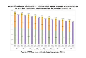Ahora bien, según los cálculos del Iaraf, si el PBI creciera 5% en 2025 y en los años posteriores, como resultado, se alcanzaría el nivel objetivo del gasto del Pacto de Mayo en el año 2033. En este caso, el gasto público consolidado sería de 24,7% del PBI y la presión tributaria efectiva del 22,9% del PBI”, explicó Nadin Argañaraz.
