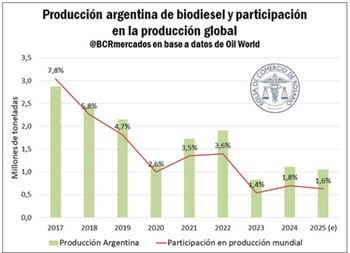 La producción argentina de biodiesel creció 40% en 2024 respecto al 2023, pero aún así fue 60% al pico alcanzado en 2017. A nivel mundial, en cambio, la producción creció un 75% en ese mismo período, según señala un informe elaborado por la Bolsa de Comercio de Rosario (BCR).