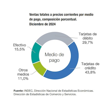 En diciembre de 2024, las ventas a precios corrientes realizadas en efectivo fueron de 344.980.374 miles de pesos, lo que representa el 15,5% de las ventas totales y muestra un aumento interanual nominal de 51,2% respecto a diciembre de 2023. Por su parte, las efectuadas mediante tarjeta de débito sumaron 662.355.087 miles de pesos, lo que representa el 29,7% de las ventas totales y una variación positiva de 68,3% respecto al 2023.