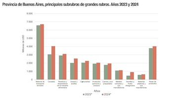 El principal rubro exportado fue material de transporte terrestre, con USD 6.709 millones y un incremento de 2,1% en relación con 2023, lo que totalizó el 22,8% de las exportaciones de la provincia. Le siguió en importancia el rubro cereales (principalmente maíz, trigo y cebada), que representó 13,8% de las exportaciones bonaerenses y registró una suba de 32,2% en relación con el nivel alcanzado el año anterior.