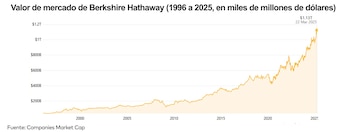 Entre puntas, de 1996 al viernes 21 de marzo, el valor de Berkshire Hathaway aumentó 2.590%, de 42.000 millones a 1,13 billones (millones de millones) de dólares. Alguien que en 1996 hubiere invertido 10.000 dólares en Berkshire podría hoy vender sus acciones en 269.000 dólares.