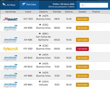 De hecho, la cartelera de vuelos del Aeropuerto a las 10:30 de la mañana de hoy no contenía información sobre arribos y en cuanto a partidas, de 12 vuelos reportaba 7 como “demorados” (6 de Aerolíneas Argentinas y 1 de JetSmart), 1 de FlyBondi como “cancelado” y 4 de Aerolíneas, todos posteriores a las 16 horas, como “en horario”, lo que delataba la expectativa de que para esa hora el aeropuerto recobraría su actividad normal.