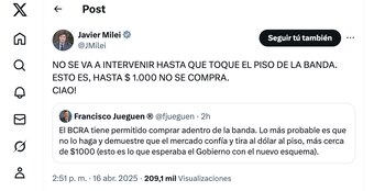 En medio del desplome de precios del dólar en el mercado mayorista, el presidente Javier Milei ratificó a través de un posteo en su cuenta oficial en la red social “X” que “no se va a intervenir hasta que toque el piso de la banda, esto es hasta $1.000 no se compra”.
