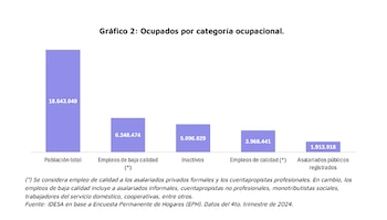 De las 13 millones de personas activas, solo 4 millones —el 21% de la población en edad de trabajar— acceden a un empleo considerado de calidad, es decir, trabajos registrados en el sector privado o cuentapropistas profesionales. En contraste, 6,2 millones de personas están ocupadas en condiciones laborales precarias: informalidad, empleo no profesional, monotributo social o trabajo en cooperativas.