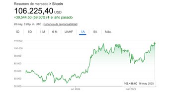 Este martes, el Bitcoin, la principal moneda virtual que concentra la mitad de la capitalización de mercado de estas emisiones, gana un 0,6%, por encima de los 106.200 por unidad. Así se aproxima nuevamente a su máximo histórico de USD 109.026 del 19 de enero de 2025,