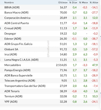Los ADR -certificados de tenencia de acciones argentinas que cotizan en las Bolsas de Nueva York- tuvieron leves subas generalizadas. Las más importantes fueron las de Cresud (+2,9%), Pampa Energía (+2,7%) y transportadora Gas del Norte (+2%).