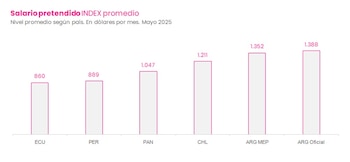 Entre mayo de 2020 y mayo de 2025, Argentina también registra la mayor brecha en las pretensiones salariales entre varones y mujeres, con una diferencia del 14,24%. Le siguen Chile (13,92%), Perú (10,51%) y Ecuador (7,21%). Panamá se mantiene con el menor nivel de diferencia, con una brecha del 3,96%.