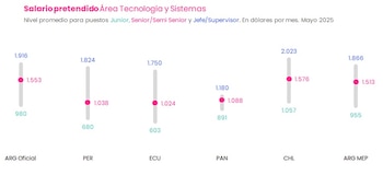 En Tecnología y Sistemas, las pretensiones varían según la jerarquía del puesto. Para el nivel junior, los candidatos en Argentina solicitan en promedio USD 980 mensuales. En el segmento senior y semisenior, la cifra se eleva a USD 1.553, mientras que los puestos de jefatura y supervisión registran una aspiración promedio de USD 1.916.