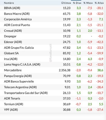 Entre los ADR y acciones de compañías argentinas negociadas en dólares en Wall Street predominaron las ganancias, encabezadas por los bancos Macro (+3,8%) y Galicia (+3,4%).