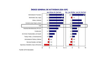El informe destaca que el repunte de junio fue impulsado principalmente por sectores como la intermediación financiera, electricidad, gas y agua, minería, y comercio. En particular, la intermediación financiera lideró el crecimiento con una suba interanual del 22,6%. Le siguieron electricidad, gas y agua con un incremento del 11,6%, minas y canteras con 9,7%, y el comercio al por mayor y menor, que creció 9,5% en relación al mismo mes del año pasado.