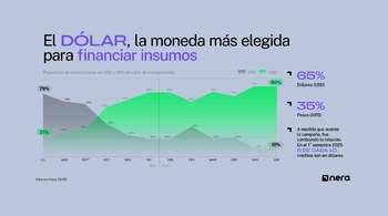 Ocho de cada diez créditos para la compra de insumos del sector agropecuario durante los primeros seis meses de 2025 fueron otorgados en dólares, según datos relevados por la plataforma digital Nera, especializada en financiamiento para el sector agropecuario.
