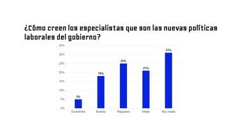 Otro eje del estudio fue la percepción sobre las políticas laborales aplicadas por el Gobierno. El 52% de los especialistas las calificó como malas o muy malas, el 25% como regulares y apenas el 23% como buenas o muy buenas. Respecto a su impacto, el 53% consideró que fue negativo en lo que va del año, mientras que solo un 17% lo valoró como positivo.