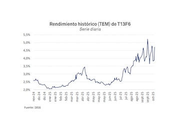 El mercado de bonos reflejó este ajuste con caídas de entre 1% y 4,7% en los CER, estirando la tasa interna de retorno de los instrumentos más cortos hasta 45,3%. Los bonos que vencen en el primer semestre de 2026 rindieron, en promedio, 32%, mientras que en plazos largos la TIR tocó el 21,8%. Los instrumentos a tasa fija con vencimiento entre octubre y enero de 2026 presentaron rendimientos entre 4,6% y 4,8% TEM, mientras que la media a partir de enero osciló en 4,2%.