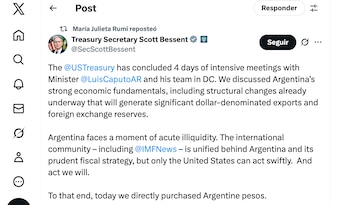 “Para tal efecto, hoy compramos directamente pesos argentinos. Además, hemos finalizado un acuerdo de swap de divisas por 20.000 millones de dólares con el Banco Central de Argentina. El Tesoro de Estados Unidos está preparado, de inmediato, para tomar las medidas excepcionales que sean necesarias para estabilizar los mercados", afirmó Bessent.