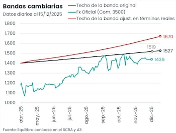 Un reporte de Equilibra observó que si en 2025 se hubiera aplicado un esquema de bandas sujeto a la inflación como el que llegará en 2026, el techo de no intervención hubiera alcanzado los $1.670 a fin de este año, nivel que le hubiera otorgado mayor margen a la estrategia del Gobierno, que estuvo en jaque en septiembre octubre ante la monumental cobertura dolarizadora en medio de las elecciones.