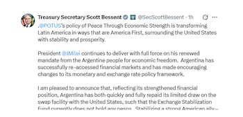 El mensaje de Bessent también abordó el aspecto político al señalar que las acciones del presidente de EEUU, Donald Trump, “está transformando a América Latina en modo America First” y rodean a EEUU de estabilidad y prosperidad. Destacó que Milei “continúa cumpliendo con firmeza el mandato renovado del pueblo argentino en favor de la libertad económica. La Argentina ha recuperado el acceso a los mercados financieros y ha implementado cambios alentadores en su marco de política monetaria y cambiaria".