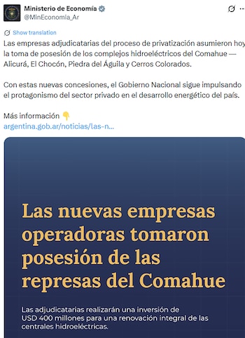 “Las empresas adjudicatarias del proceso de privatización asumieron hoy la toma de posesión de los complejos hidroeléctricos del Comahue —Alicurá, El Chocón, Piedra del Águila y Cerros Colorados. Con estas nuevas concesiones, el Gobierno Nacional sigue impulsando el protagonismo del sector privado en el desarrollo energético del país”, comunicó la cartera que encabeza el ministro Luis Caputo en la red X.