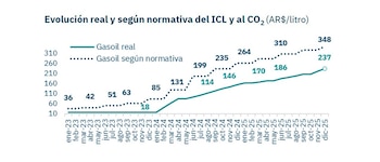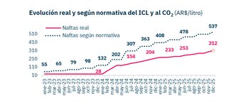 El informe detalla que el desfasaje entre la evolución normativa del impuesto y su aplicación real se fue profundizando a lo largo del año. Mientras el monto del ICL y del impuesto al CO₂ debería haberse ajustado de forma periódica siguiendo la inflación, el Gobierno decidió fraccionar los aumentos para moderar el impacto sobre el precio final de las naftas y el gasoil.