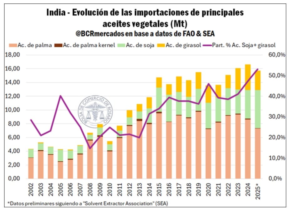 A partir de mediados de esa década, y especialmente en la última, la participación de los aceites argentinos de soja y girasol se fue consolidando hasta alcanzar un máximo del 53,1% del total importado por India en 2025.