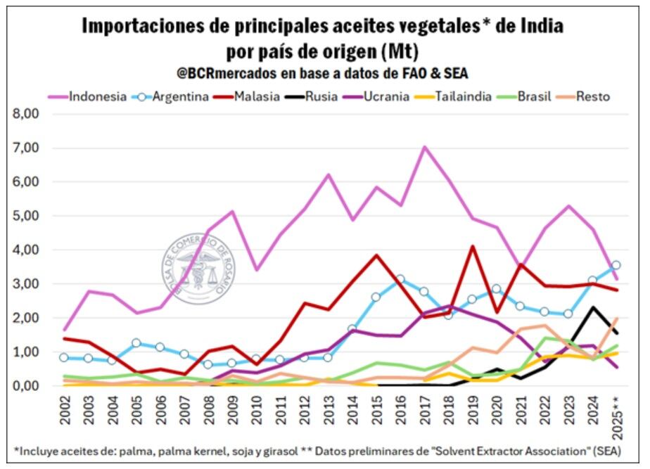 El informe explica que, ante la estructura productiva de India —que produce grandes cantidades de cereales como trigo y arroz pero tiene una producción baja de oleaginosas en comparación con sus necesidades de consumo— el país asiático depende en gran medida de importaciones para abastecer su mercado interno de aceites vegetales. Esta dinámica posicionó a Argentina como su principal proveedor mundial de aceites vegetales en 2025, al menos desde 2002, cuando comienzan las series comparativas.