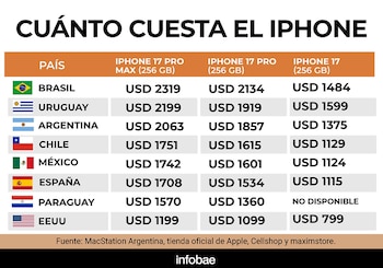 En Uruguay, los precios son más altos: el iPhone 17 Pro Max alcanza los USD 2.199 y el iPhone 17 Pro ronda los USD 1.919. En Brasil, el Pro Max se vende a unos USD 2.319, y en México el valor del mismo modelo se aproxima a los USD 1.742.