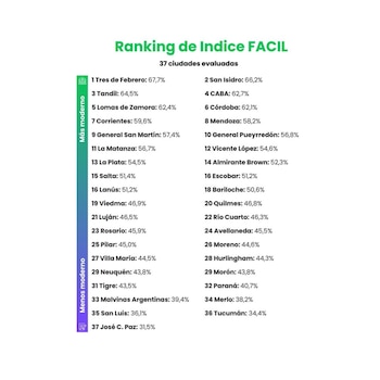El Índice FACIL 2025 también presenta un ranking general de desempeño que ordena a los municipios según el grado de simplificación, digitalización y claridad de sus trámites administrativos. La clasificación refleja diferencias marcadas entre jurisdicciones y pone en evidencia la heterogeneidad de las políticas locales en materia de modernización del Estado.