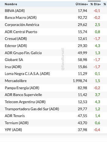 Encabezan las subas de los ADR de Edenor y Telecom, con un 4,3 por ciento. El gigante de comercio electrónico Mercado Libre mantiene una tendencia positiva con una suba del 1,5% y cotiza cerca de los 2.000 dólares.