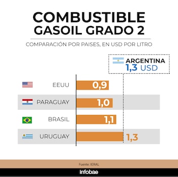 En combustible, la situación fue diferente. El gasoil grado 2 se ubicó 21,4% por encima del promedio de los otros cuatro países, lo que posicionó a Argentina como el mercado más caro del conjunto en este rubro.