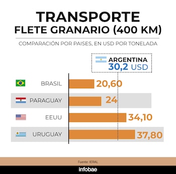 En servicios de transporte de carga, específicamente en el flete granario, el valor local fue 3,7% superior al promedio general. El precio argentino resultó más caro que en Brasil y Paraguay, pero más barato que en Uruguay y Estados Unidos.