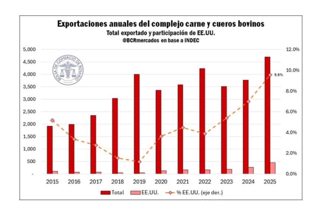 El crecimiento del mercado estadounidense ha sido sostenido. Desde la reapertura de dicho destino en 2019, la participación de Estados Unidos en el complejo de carnes y cueros pasó de un marginal 1,2% a un 9,6% al cierre de 2025. Esta evolución se vincula con factores internos del país norteamericano.