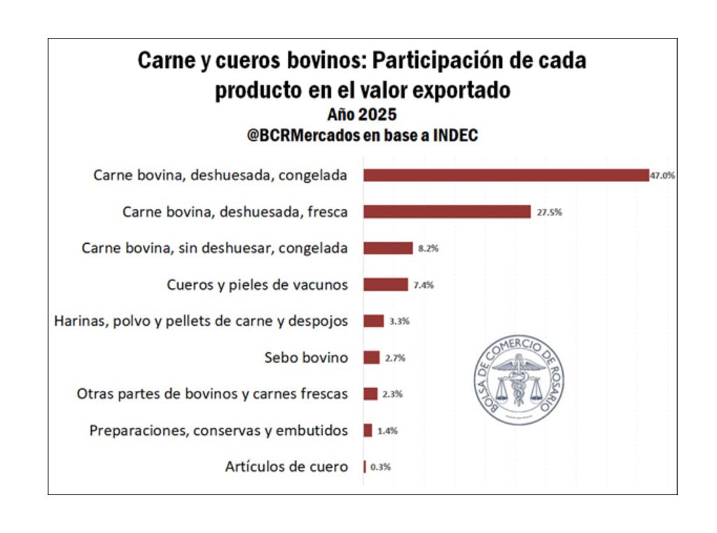 Al desagregar los USD 4.727 millones aportados por el complejo, se observa que la carne, en sus diversas presentaciones, constituye el núcleo del negocio. Las exportaciones de carnes representaron el 82% del valor total del complejo. El producto de mayor peso individual fue la carne bovina deshuesada y congelada, que con USD 2.205 millones dio cuenta del 47% del total exportado.