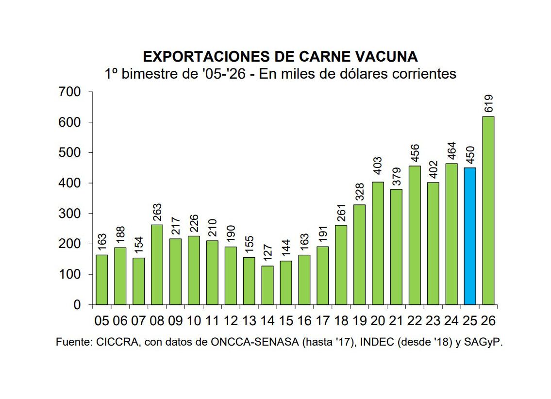 Mientras el mercado interno se contrae, el sector exportador muestra un desempeño diferente. En el primer trimestre de 2026 se estima que se enviaron al exterior 187,4 mil toneladas res con hueso, lo que representa un crecimiento del 11,4% respecto al año previo. Esta mayor demanda externa contribuye a la presión sobre la oferta disponible para el consumo local.