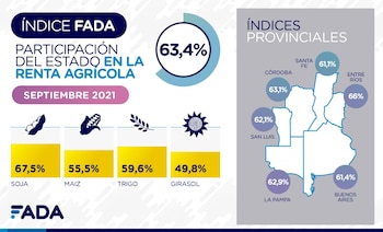En ese sentido, el índice que de manera trimestral elabora la Fundación Agropecuaria para el Desarrollo de Argentina (FADA), reflejó en el presente mes que la participación del Estado en la renta agrícola fue del 63,4% para el promedio ponderado de los cultivos de soja, maíz, trigo y girasol, presentando un aumento del 1,6% en comparación con junio pasado. Esto significa, que de cada $100 que genera el productor (ingresos menos costos), $63,40 se lo llevan los distintos niveles del Gobierno a través del cobro de impuestos.