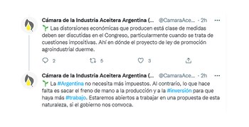 Tras los anuncios, la Cámara de la Industria Aceitera y el Centro Exportador de Cereales (CIARA-CEC) expresaron su preocupación por la nueva medida. Desde su cuenta de Twitter expresaron: “La #Argentina no necesita más impuestos. Al contrario, lo que hace falta es sacar el freno de mano a la producción y a la #inversión para que haya más #trabajo. Estaremos abiertos a trabajar en una propuesta de esta naturaleza, si el gobierno nos convoca”.