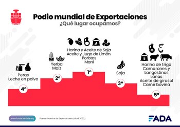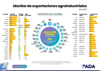 Un relevamiento realizado por la Fundación Agropecuaria para el Desarrollo de Argentina (FADA) reflejó que durante el 2021 las exportaciones de las cadenas agroindustriales generaron ingresos por USD 54.895 millones. Dicha cifra representó 7 de cada 10 dólares que aportó el agro en materia de ventas al exterior y el 70% del total que el país vendió al mundo. Además, Argentina sigue como el principal exportador de aceite y harina de soja, aceite y jugo de limón, maní, y porotos; segundo exportador de maíz y yerba mate, y tercero en granos de soja.
