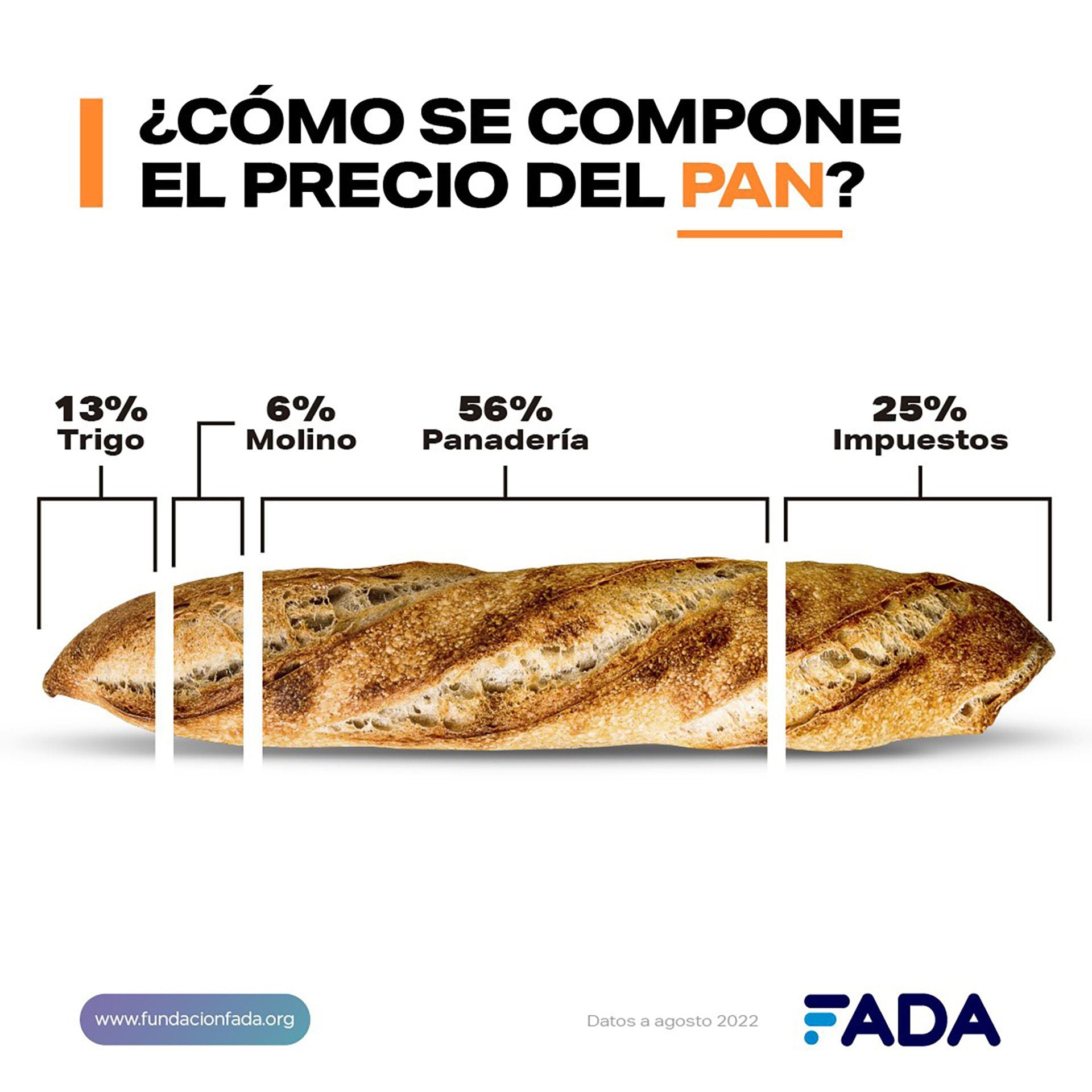Además, el trabajo también detalla que del campo a la mesa de los consumidores el precio del trigo se multiplica por 7,3. “Del total que paga el consumidor por kilo de pan francés, aparte del 13% que representa el trigo, el molino participa un un 6%, la panadería en un 56% y los impuestos en un 25%. “Para decirlo de otra forma, el consumidor pagó en promedio $320 el kilo de pan, de los cuales $80 corresponden a la carga tributaria”, afirmó Ariño.