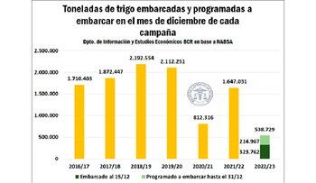 El relevamiento que realizó la Bolsa de Comercio de Rosario, contemplando los buques de trigo despachados entre el 1° y el 15 de diciembre y lo programado a embarcar hasta el 31 de dicho mes, estimó que se despacharán al mercado internacional unas 540 mil toneladas, es decir un 66% de caída en relación al volumen despachado en todo diciembre de 2021, cuando se alcanzó los 1,6 millones de toneladas. El menor nivel de embarques está relacionado a la caída en la producción.