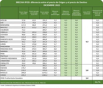 En diciembre pasado, el consumidor en supermercados o comercios pagó por los alimentos casi tres veces y medio el precio que recibió el productor agropecuario que los entregó a la cadena comercial en el campo. Es decir, se mantiene en niveles altos la brecha de valores que existe entre los mencionados sectores de la cadena comercial.