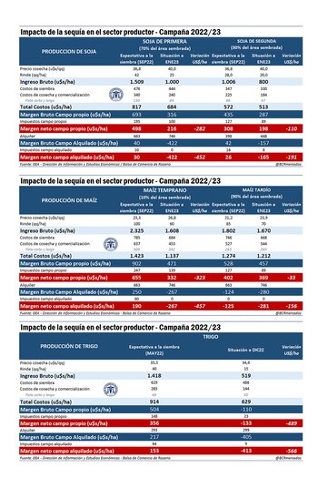 En relación al productor que alquila la tierra, “se estiman pérdidas de USD 452 por hectárea de soja temprana y USD 191 en el caso de la soja que sigue a un trigo u otro cultivo de invierno. En maíz, la caída del margen neto asciende a USD 457 por cada hectárea destinada al grano de la variedad temprana y USD 156 por cada hectárea que sembró con maíz tardío. Y en trigo, la pérdida asciende a USD 566 por cada hectárea que alquiló para producir”.