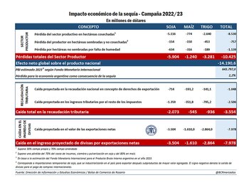 Ante el avance de la sequía y a lo que suman por estas horas las elevadas temperaturas, la Bolsa de Comercio de Rosario recortó la proyección de cosecha de soja, trigo y maíz en 28,5 millones de toneladas, un 23% de la producción que se esperaba en el inicio de la campaña. Todo esto derivaría en que la pérdida de ingresos netos del sector productor ya asciende a USD 10.425 millones, que sería el equivalente a 2,2 puntos porcentuales del PBI que el Fondo Monetario Internacional estima para nuestro país en 2023.