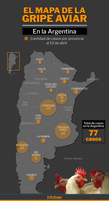 Según datos del Servicio Nacional de Sanidad y Calidad Agroalimentaria (Senasa), hasta el momento se confirmaron 78 detecciones de la enfermedad: los casos confirmados son 62 en aves de traspatio, 11 en el sector comercial y 5 corresponden a aves silvestres. En cuanto a la distribución territorial, los positivos se ubicaron mayormente en Córdoba, con 19 casos; Buenos Aires, 18; Neuquén, 10; Santa Fe, 9; Río Negro, 6; Chubut, 4; Corrientes, San Luis y Chaco, 2 cada una; y La Pampa, Jujuy, Santiago del Estero, Salta y Formosa, uno cada uno. El mapa adjunto muestra la distribución al 13 de abril, cuando se registraban 77 casos.