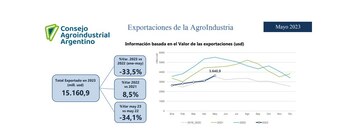 Las exportaciones del sector agroindustrial ascendieron a USD 15.161 millones en los primeros cinco meses del 2023, cifra que exhibió una merma del 33,5% respecto a igual periodo del 2022. El dato surge del informe elaborado por el Consejo Agroindustrial Argentino (CAA), realizado a mayo del 2023, donde se contabilizaron los despachos en valor concretados por cada uno de los complejos del sector.
