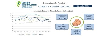 Las exportaciones realizadas por el segmento de la Carne Vacuna, y también por el sector Cueros, logró cerrar ventas por USD 3.111 millones, por lo que reportó una caída del 17,9% en los ingresos percibidos casi exclusivamente por una fuerte caída en el precio internacional del producto, ya que el volumen despachado fue uno de los mejores de los últimos años.