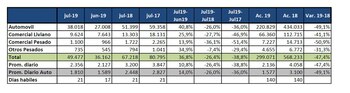La Asociación de Concesionarios de Automotores de la República Argentina (Acara) informó que durante julio de 2019 se patentaron 49.477 vehículos, un 26,4% menos que en el mismo mes del año anterior. Pero la entidad destaca que por el plan de subsidios del Gobierno –"Junio 0KM", que siguió en julio y se prorrogó a agosto– se registró una suba de 36,8% en la comparación mensual.