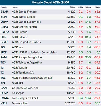 En Wall Street, los ADR’s argentinos, certificados de tenencia de acciones, tuvieron un día negativo. Central Puerto 5,94% y Despegar 4,46%, fueron los más afectados. Los únicos ganadores fueron IRSA Propiedades Comerciales 3,32%. También subió Loma Negra, pero fue un porcentaje marginal de 0,38 por ciento.
