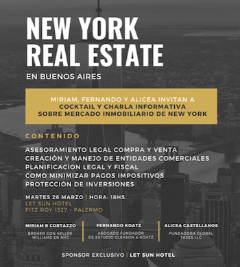 Nueva York Real Estate en Buenos Aires se realizará este martes 26 de marzo a las 18 en el Hotel Let Sun (Fitz Roy 1527, Palermo). El evento es sin cargo y requiere confirmación previa a esta dirección de correo electrónico: nycrealestate@miriamcglobalre.com