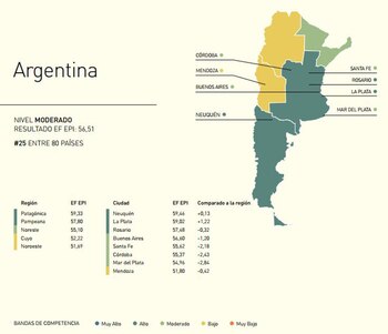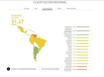 El ranking se realizó por séptima vez. Argentina, en esta edición, logró su peor posición y quedó afuera por primera vez de los 20 mejores. Registró un descenso en su nivel. Pasó de "alto" a "medio" con una clasificación del 56,51% que, de igual modo, supera al promedio regional que es de 51.47%.