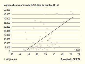 A su vez, el informe encontró una estrecha relación entre el nivel de inglés y el poder adquisitivo en Argentina. Como muestra el gráfico, a medida que aumentan los ingresos brutos percibidos también se dispara la calificación recibida en el examen.